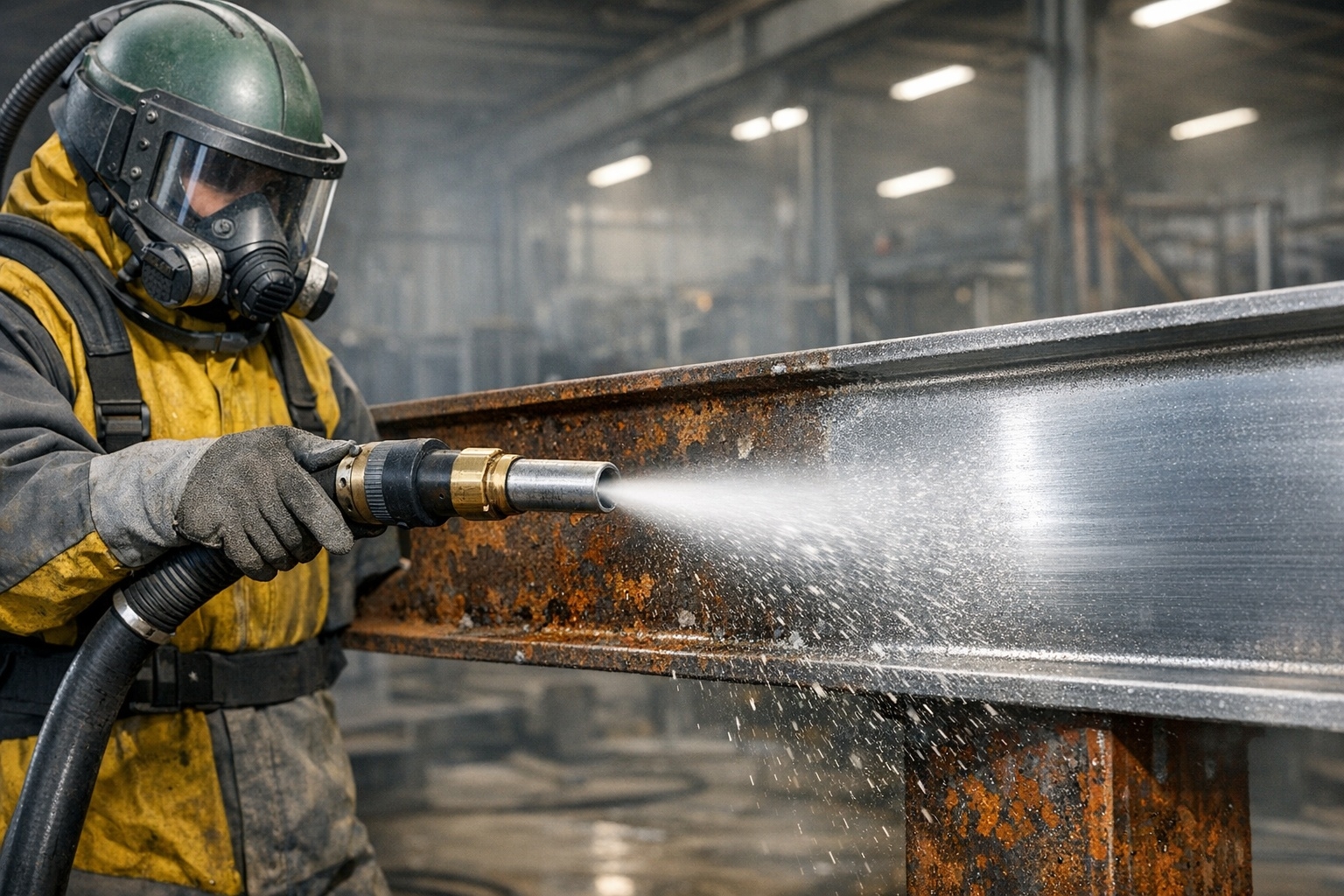 Через сопло смесь выбрасывается на обрабатываемую поверхность металла. Абразивные частицы разбивают слои ржавчины, краски, окалины. Процесс создает шероховатость поверхности высотой 30–80 микрометров. Это оптимальный профиль для последующей покраски металлоконструкций.